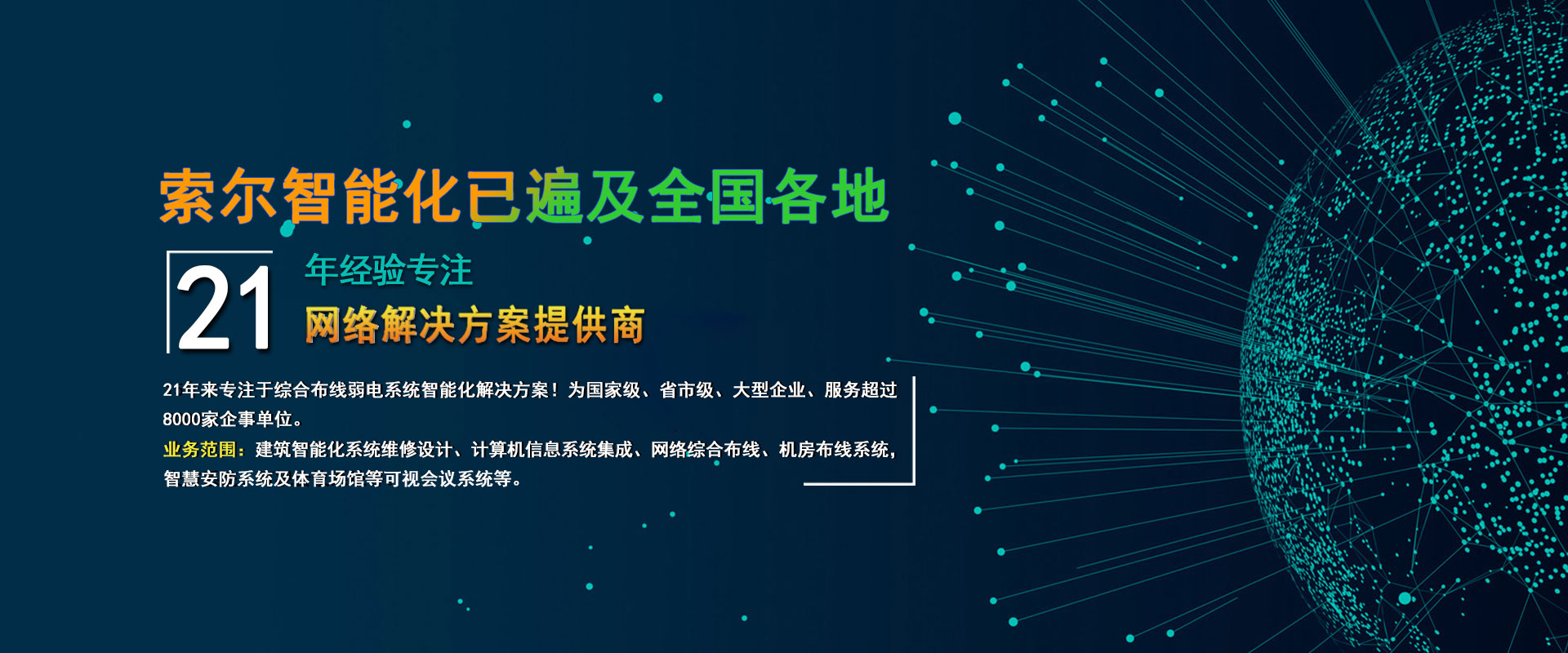 索尔集团股份有限公司简称“索尔”或"索尔集团",成立于2004年4月13日,拥有行业多项专业资质,是专业从事综合布线产品、特种定制线缆和电线电缆产品研发、设计、制造、销售及智能化信息系统集成于一体的高新技术国家级小巨人企业。为了提高市场覆盖和客户服务质量,集团先后在湖南、江西、北京、上海等地建立了分支机构及服务网点。